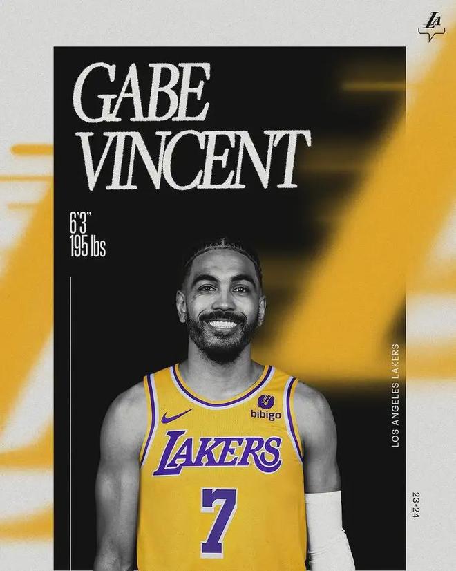 2023年7月1日,自由市场开启后的第一时间,湖人3年3300万美元签下文森特。2023-24赛季,文森特因伤打了11场比赛。场均出战19.8分钟,仅得3.1分0.8篮板1.9助攻0.8抢断0.5失误,三项命中率:30.6%,10.7%,50%。